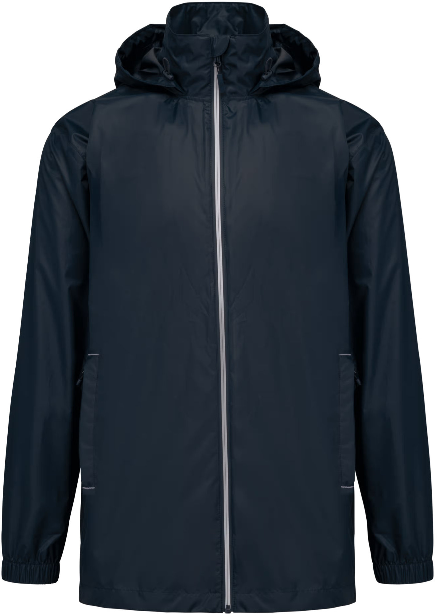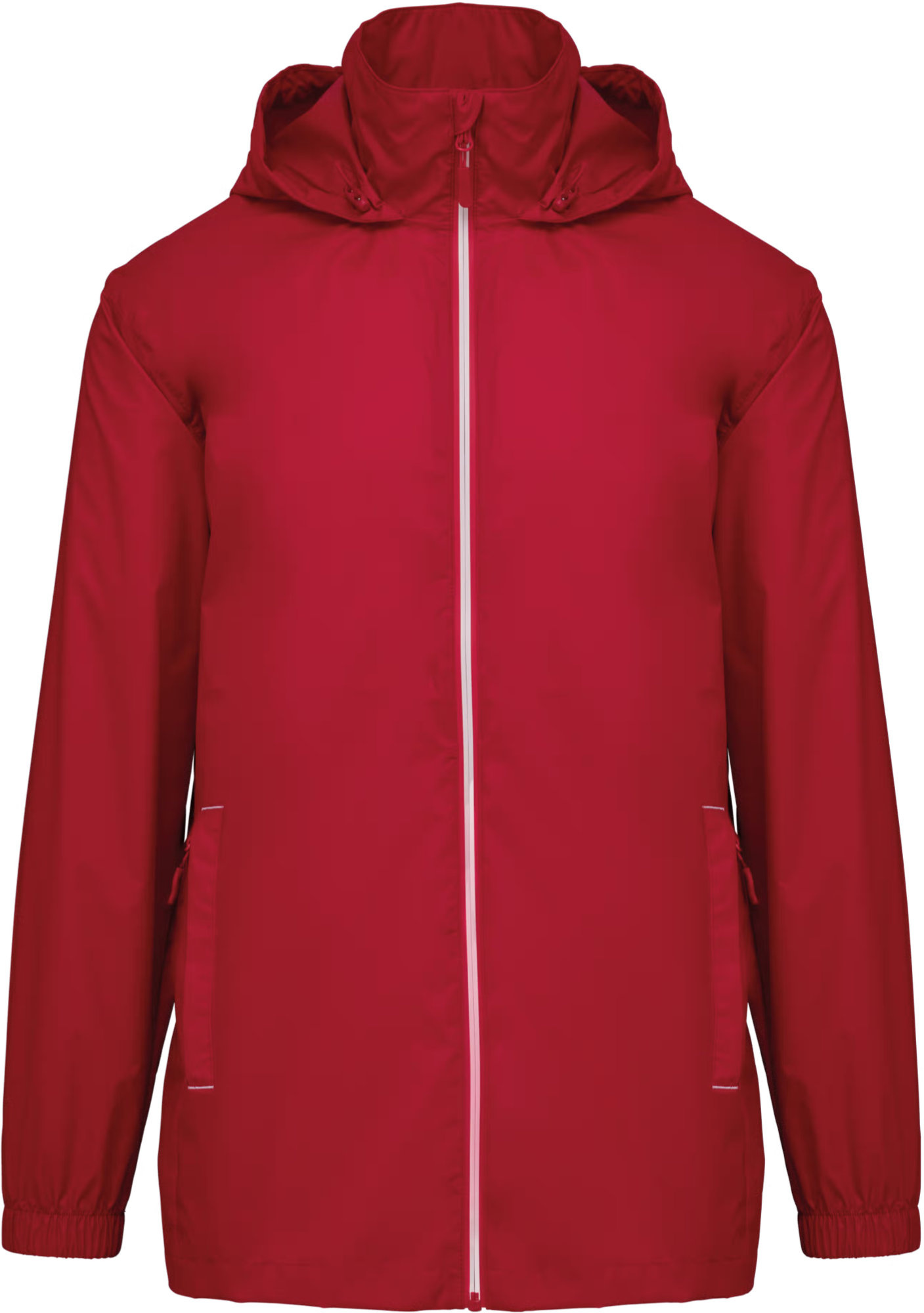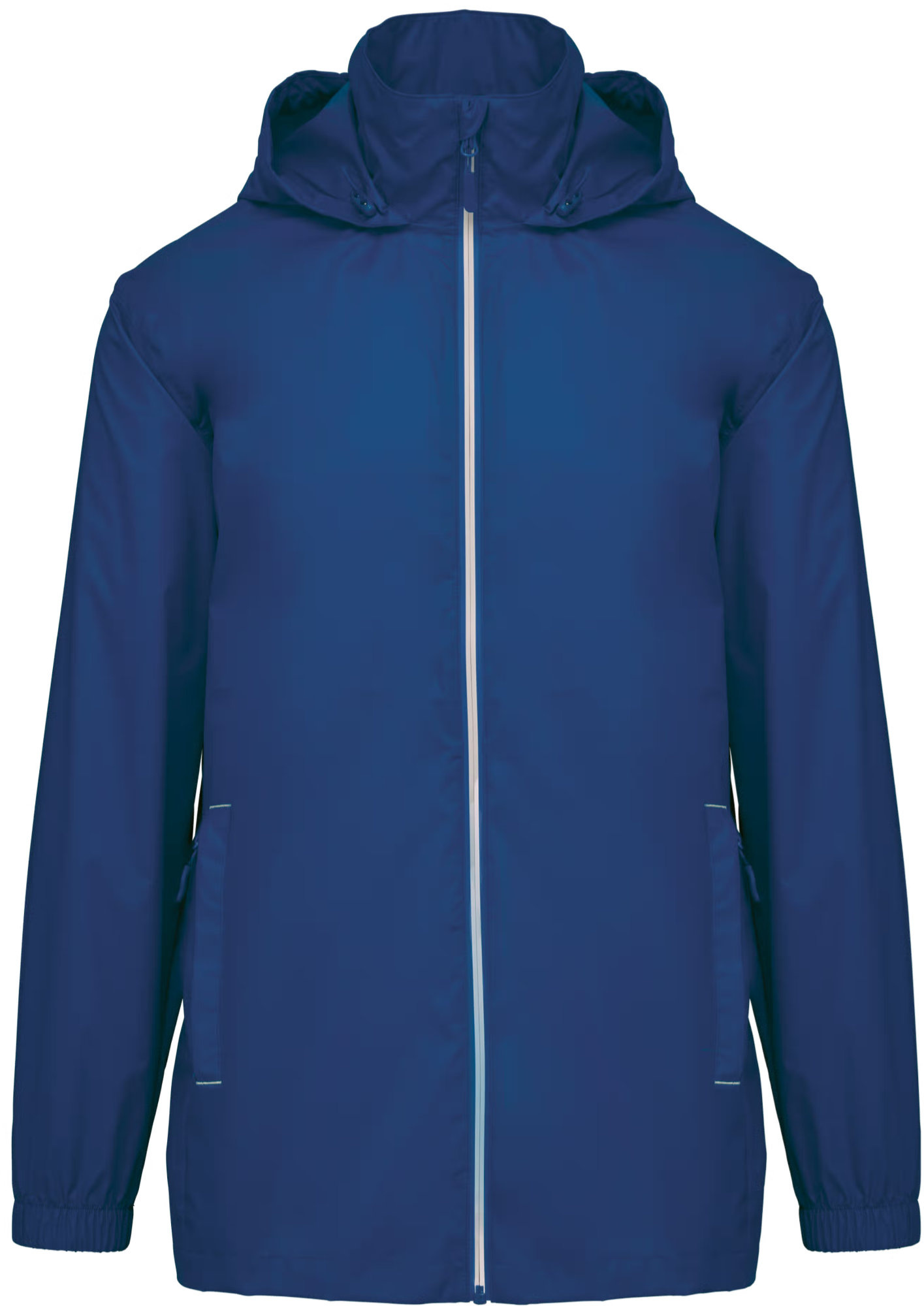 Trotseer ieder weer met de nieuw lichtgewicht, unisex regenjas van Kariban ProAct. Deze eenvoudige, maar moderne regenjas is gemaakt van 100% mat polyester 210T met PU-coating. Deze waterdichte stof van 1500mm weegt slechts 80 gram per vierkante meter zodat de jas je niet verzwaart tijden het sporten in de regen. De jas is voorzien van twee afsluitbare zijzakken en twee binnenzakken, heeft een aanpasbare capuchon met stopkoorden in de kraag en klittenbandsluiting en is voorzien van elastische manchetten zodat er minder snel water je mouwen in loopt.
